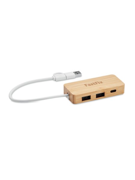 3 Port USB-C/A-Hub im Gehäuse aus Bambus. Ausgang: 2 x Typ-A und 1 x Typ-C. Eingang: 2-in-1 Typ-C & Typ-A. Kabellänge: 20 cm.