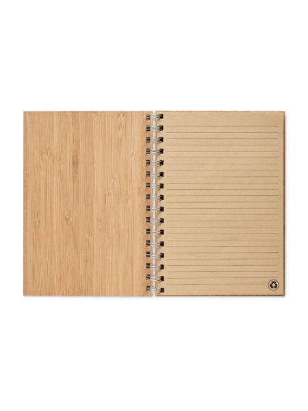 DIN A5 Notizbuch mit Cover aus Bambus. 70 Blatt (140 Seiten) liniertes Kraftpapier. Spiralbindung. Bambus ist ein natürliches Produkt, es kann daher zu leichten Abweichungen in Farbe, Dekor und Maßen kommen.