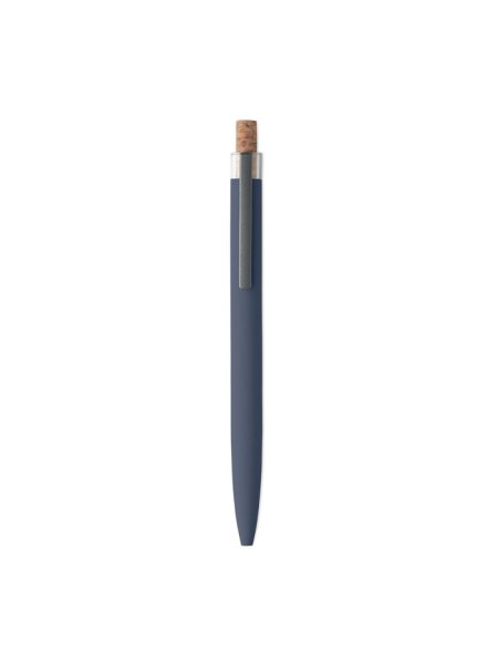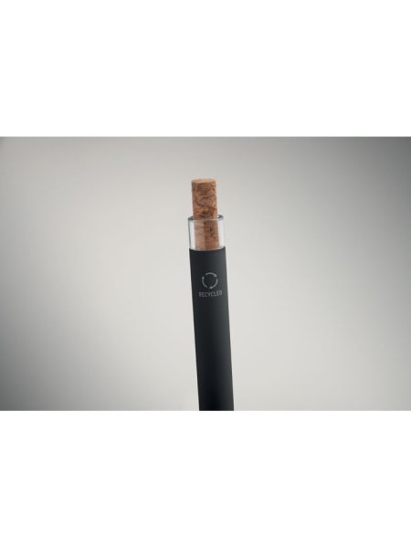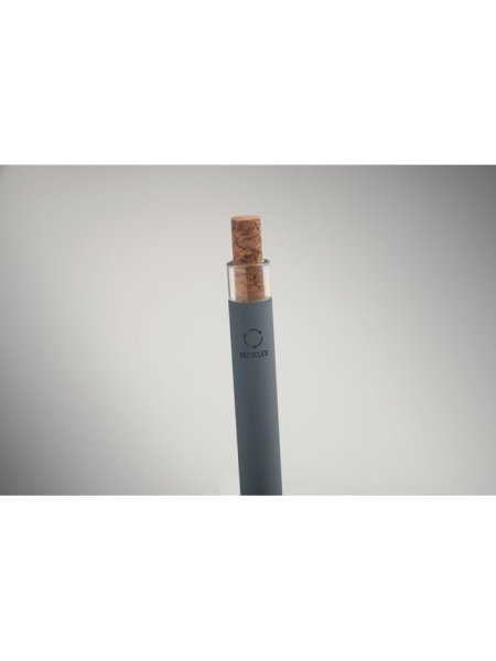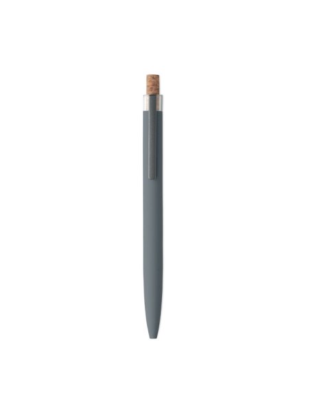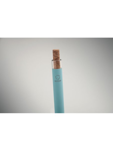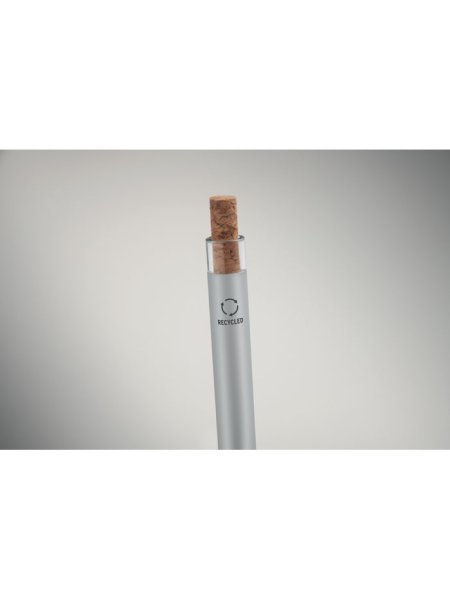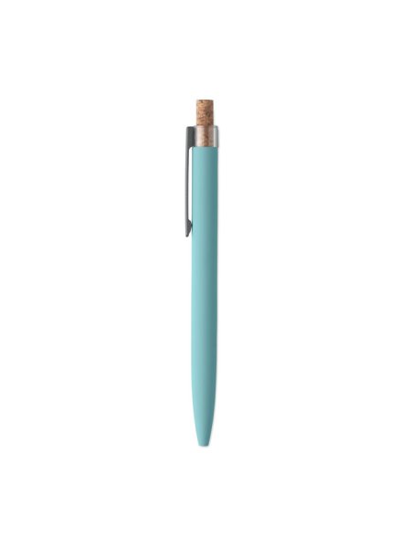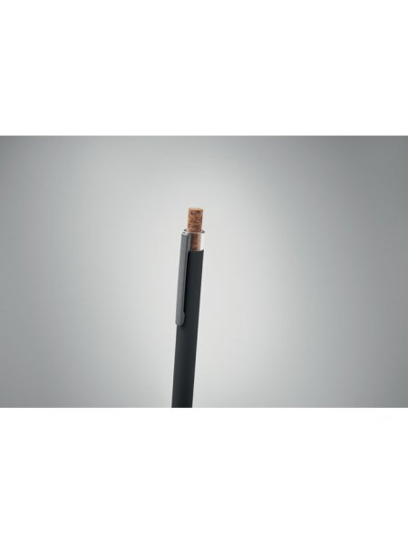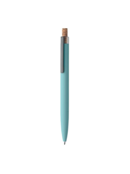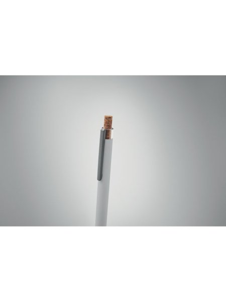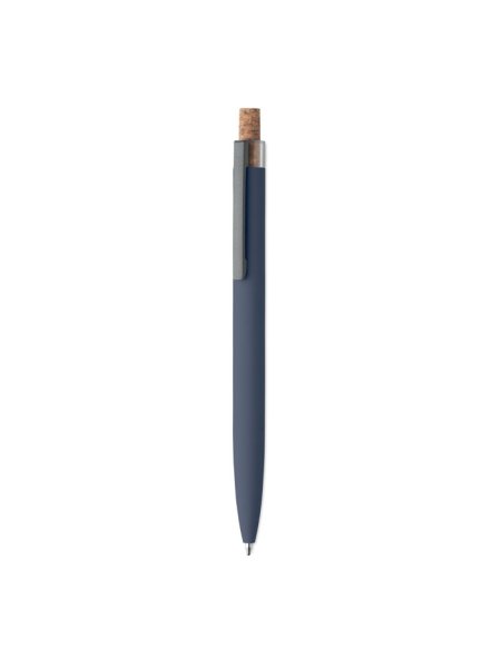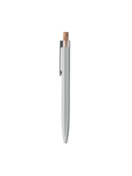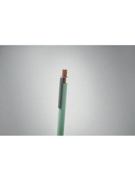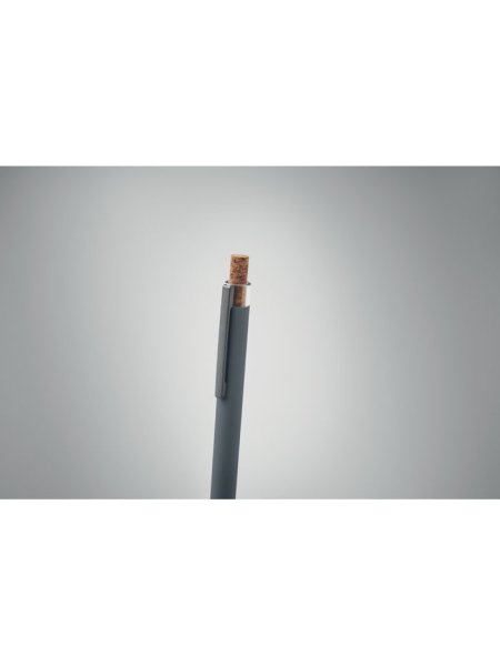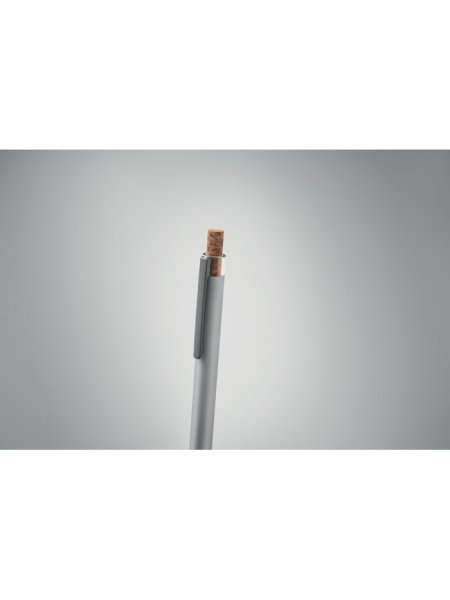 Druckkugelschreiber aus recyceltem Aluminium. Drücker mit Kork, Clip aus Metall. Blaue Tinte.