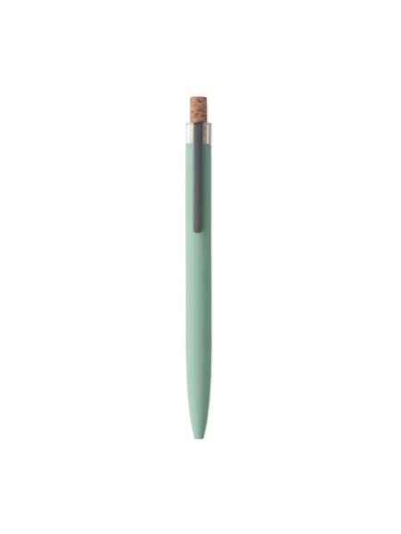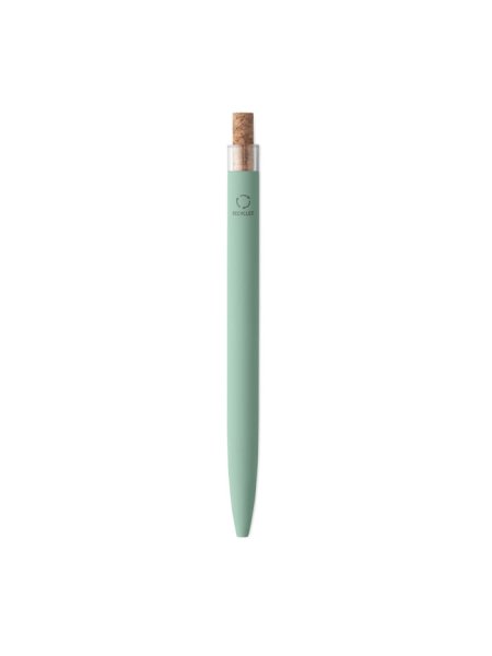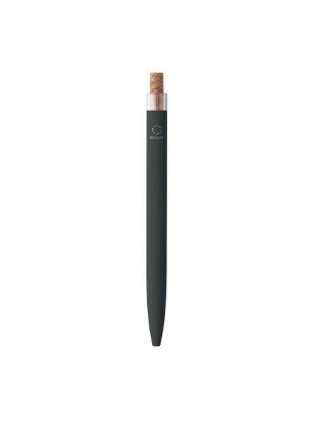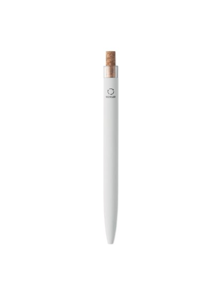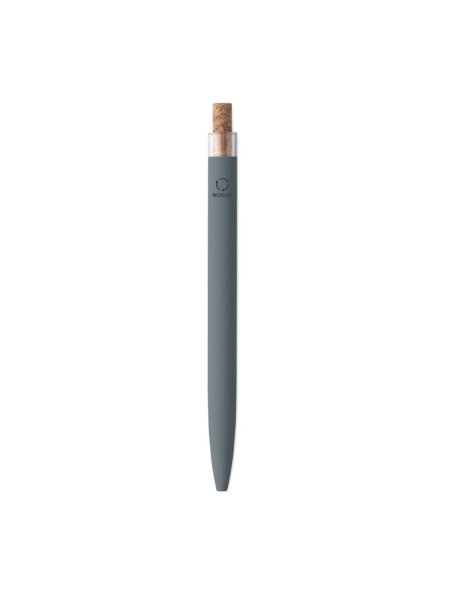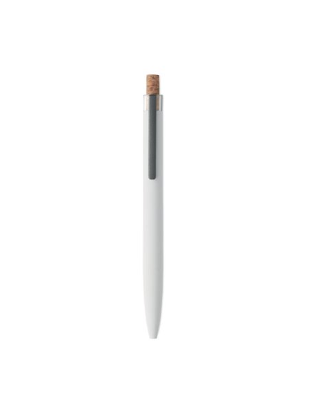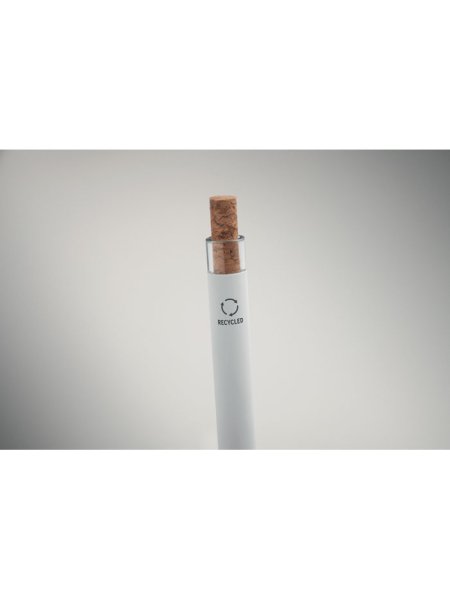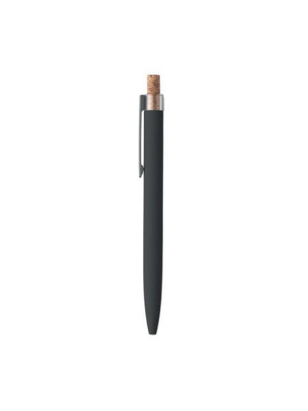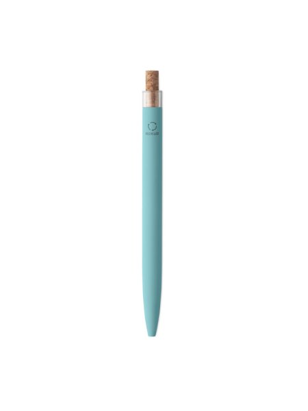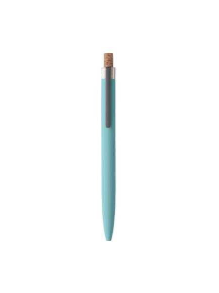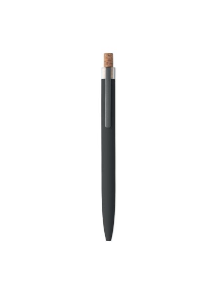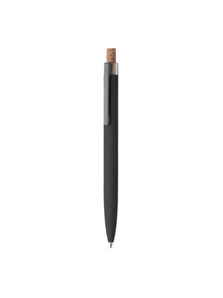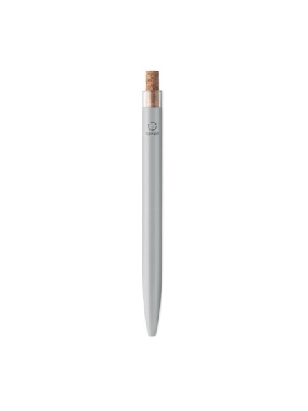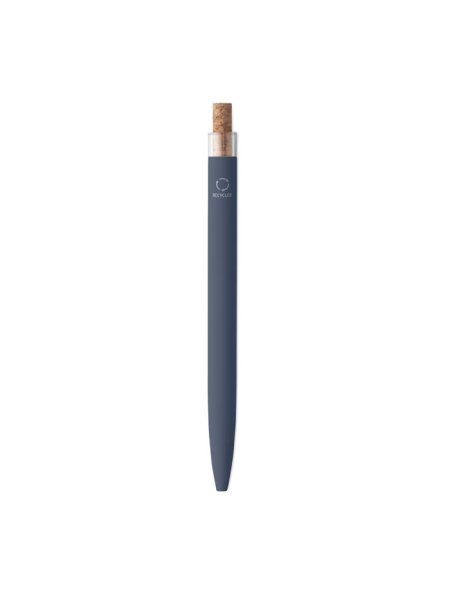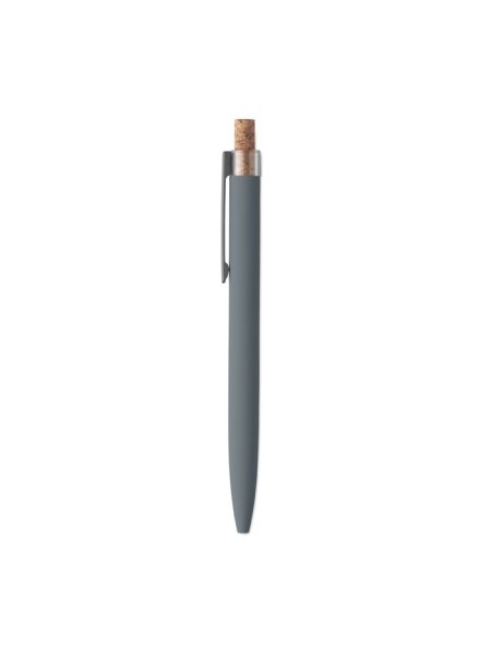 Druckkugelschreiber aus recyceltem Aluminium. Drücker mit Kork, Clip aus Metall. Blaue Tinte.