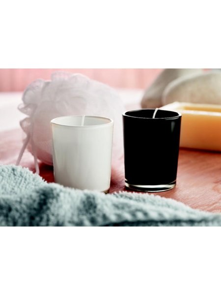 Kleine Duftkerze in farbigem Glas. Duftvarianten: schwarz: Sandelholz, weiß: frische Wäsche, gold: Vanille.50gr.