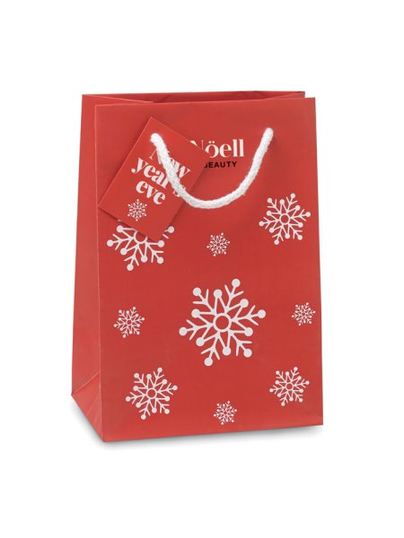 Elegante Geschenkpapiertüte mit Motiv ''Schneeflocke''. Inklusive Geschenkanhänger. Klein.