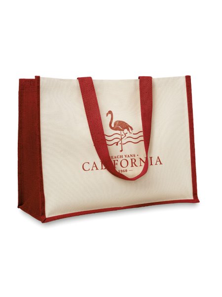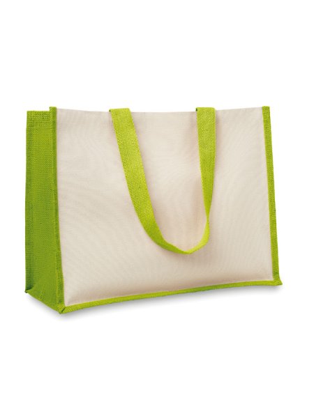 Die Jute -Shopping Tasche kombiniert die Strapazierfähigkeit von laminierter Jute an Seiten und Boden mit der Flexibilität von Canvas an der Front. Mit langen Griffen ausgestattet, bietet sie ausreichend Platz für Einkäufe und den täglichen Gebrauch. Robuste, umweltfreundliche Tasche für nachhaltige Einkäufe.