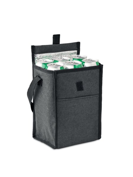Lunch-Tasche aus 600D RPET mit Isolierung. Fronttasche. Fassungsvermögen 3 l. Isoliermaterial: Aluminiumfolie + 2 mm PE-Schaumstoff.