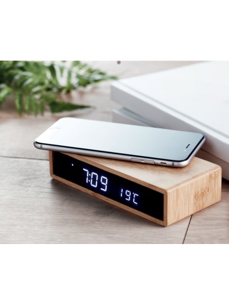 Diese elegante LED-Tischuhr mit kabelloser Ladefunktion verfügt über ein Gehäuse aus Bambus.