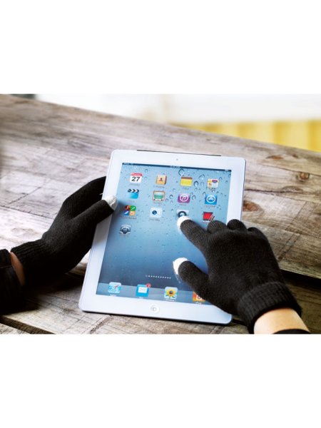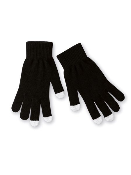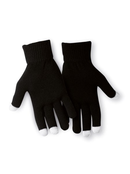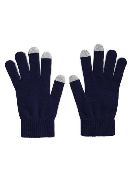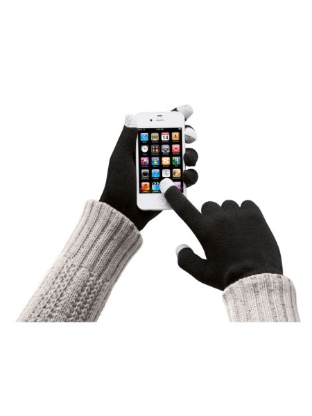 Touchscreenfähige Handschuhe aus Acryl. 3 Fingerspitzen bestehen aus 0,5% Edelstahlfaser, 89,5% Acryl und 10% Elasthan. Die Größe der Handschuhe kann aufgrund des Elasthan Anteils variieren.